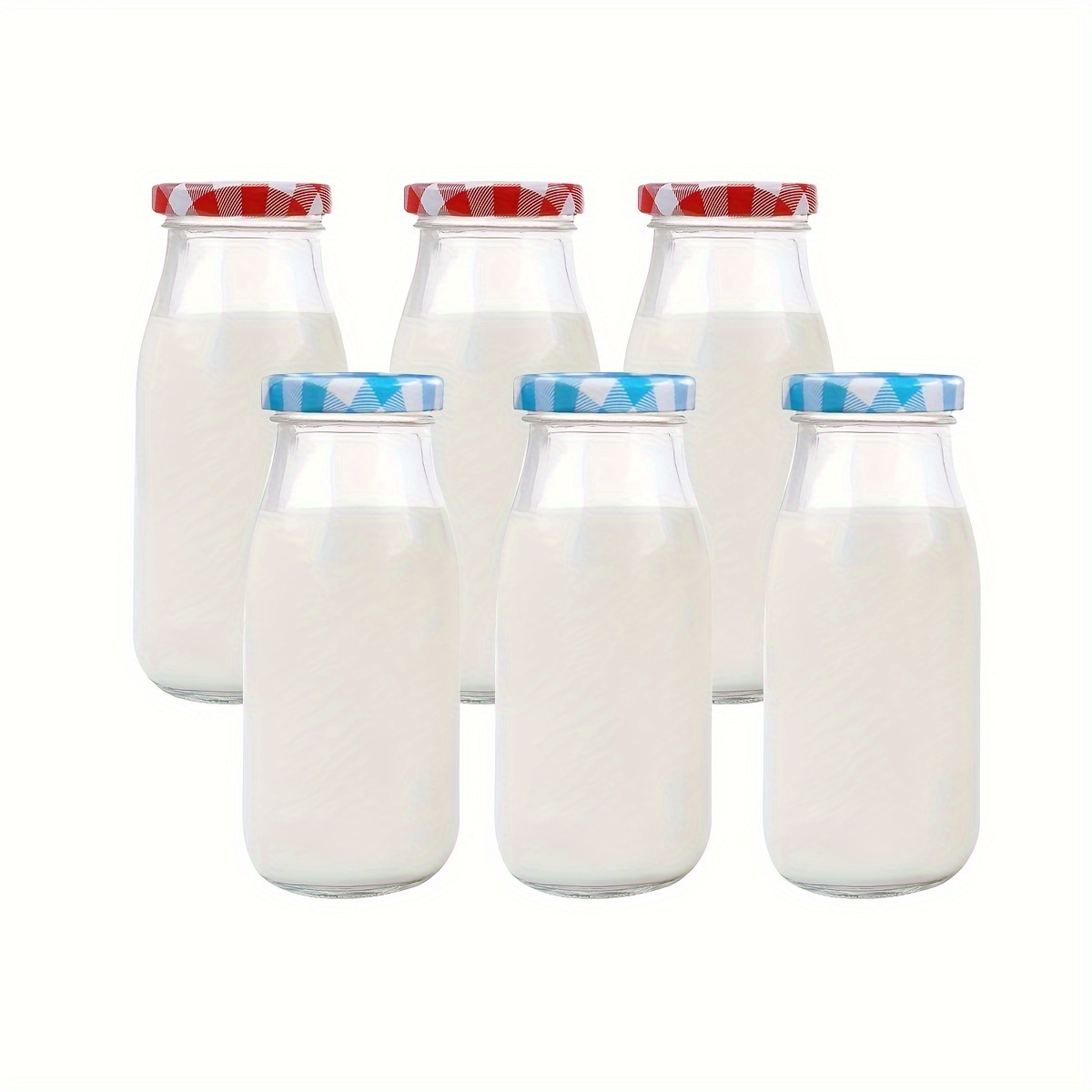 TEMU 6/8/12pcs, Glass Milk Bottle With Lid – Red, Blue Lid – Juice Storage And Distribution Bottle Set, 8oz Glass Bottle With Lid, Milk Juice Bottle