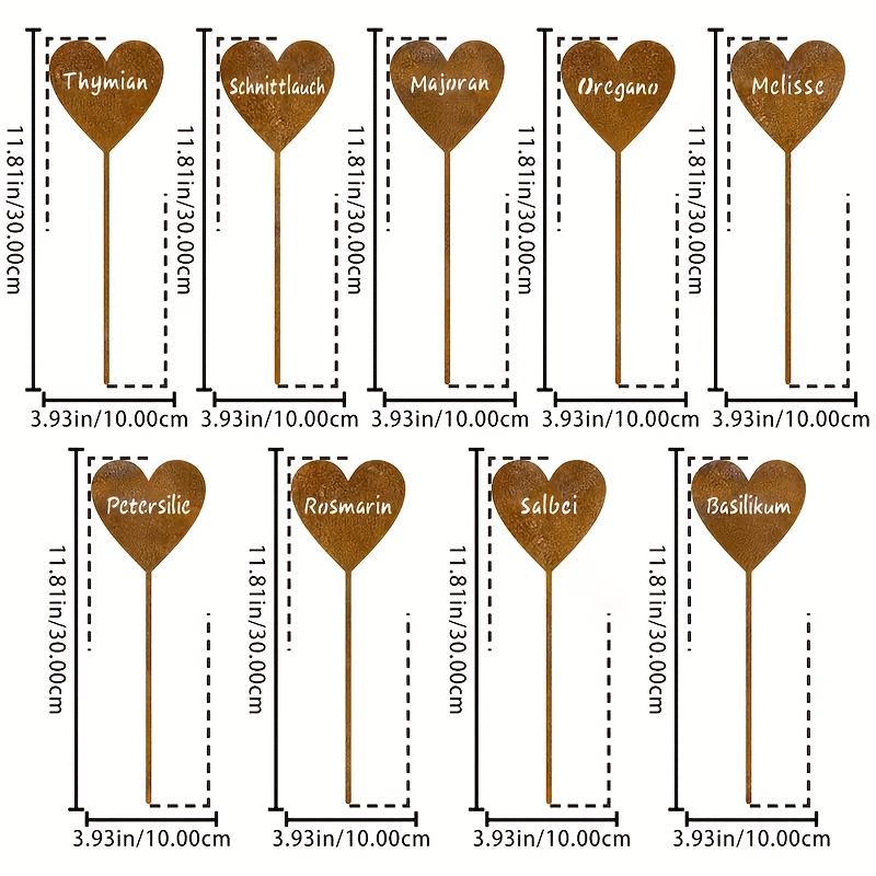 TEMU 9 Stück Glitzernde Metall-Herzförmige Garten-Schilder – “Salbei, , Majoran, Oregano, Basilikum, Schitteluch, , Rösmarin, Petersilicum” –