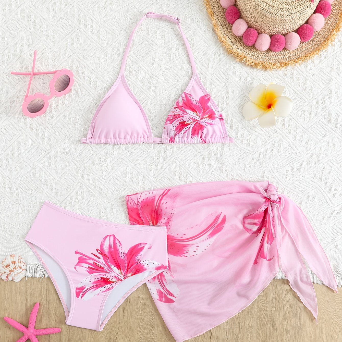 TEMU Cute Tween Floral Bikini Swimsuit Set With Sarong (print Style Random) Young Girls Sets Swim Suits For Women Bathing Suit Set Bathing Suits For