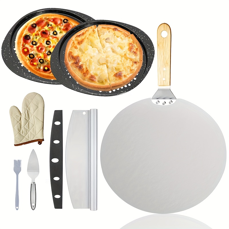 TEMU Pizza 7pcs Pizza Peel Pizza Pan Set, 12" X 14" Pizza Spatula, Pizza Paddle With Rocker Cutter Scraper Pie Server Oil Brush, Pizza Oven
