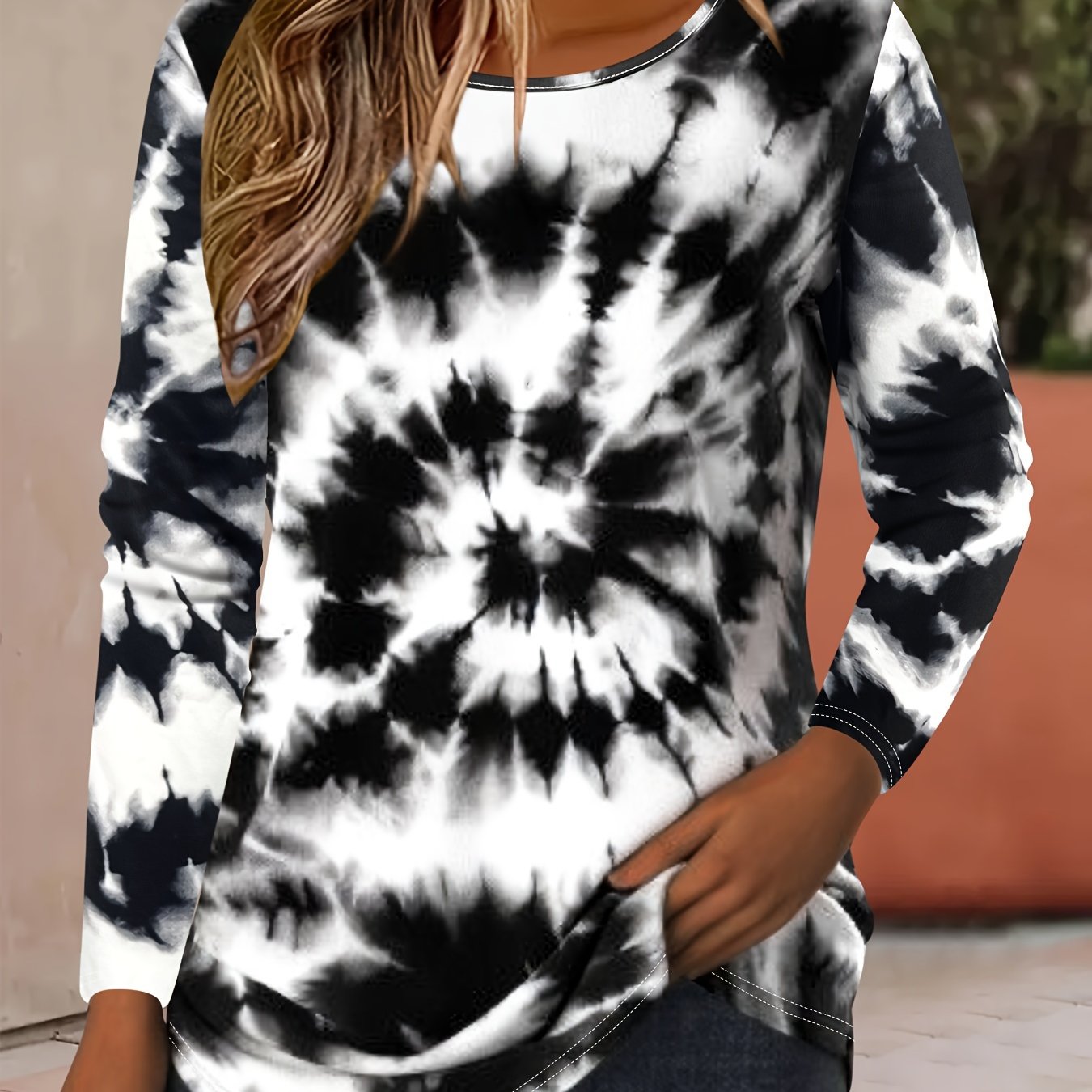 TEMU Women’s Fashion Tie-dye Print Long Sleeve T-shirt, Casual Round Neck, Knit Fabric, Polyester,